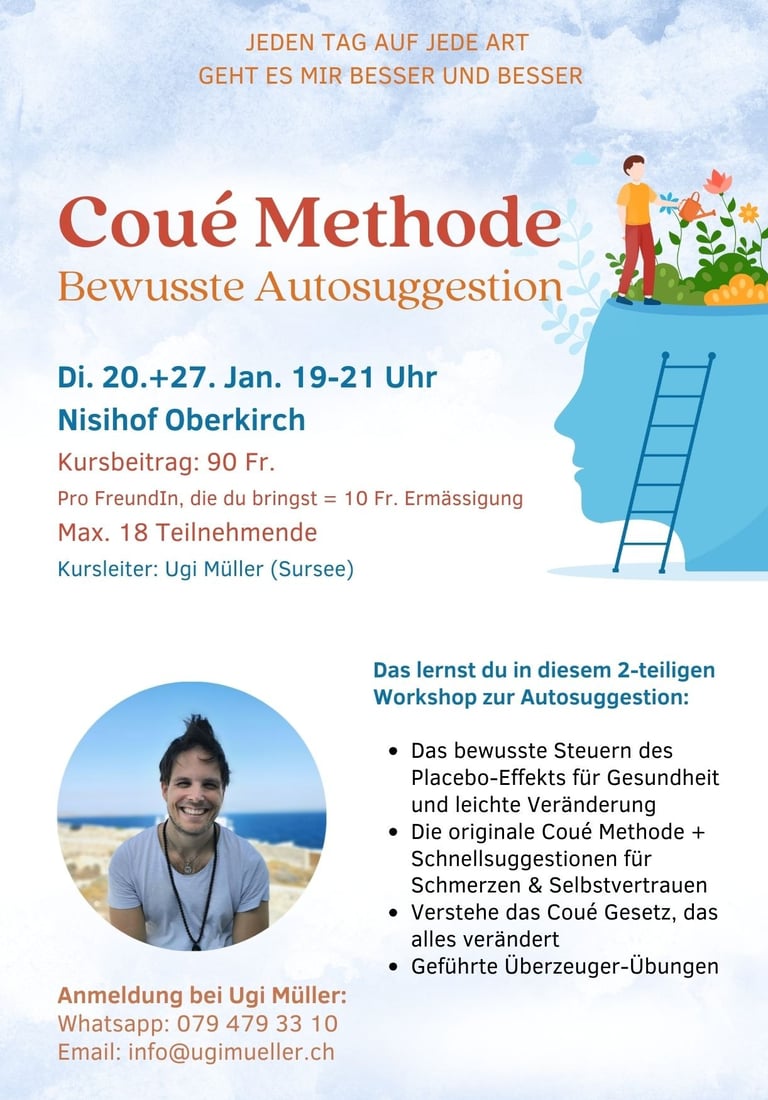 In diesem 2-teiligen Workshop ergründen und erleben wir die originalen, lebensverändernden Prinzipien hinter der Coué Methode. Du lernst genau, warum und wie diese zeitlose Methode wirkt, wie du sie fehlerfrei anwendest und sie nachhaltig in dein Leben integrierst. Tauche ein in die Tiefe dieser faszinierenden und effektiven Selbsthilfe-Methode und lerne dich von einer ganz neuen Seite her kennen.